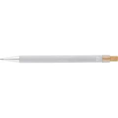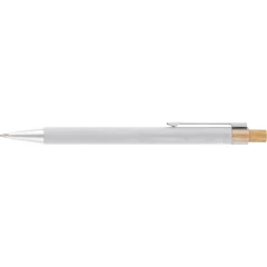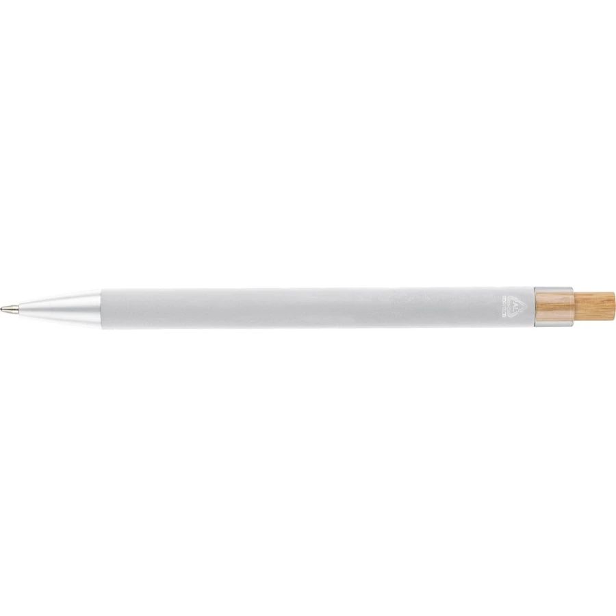Długopis, bambusowy przycisk, metalowy klips, wkład w niebieskim kolorze, ikona recyklingu na produkcie, wystarcza na ok. 800 m pisania, produkt wykonany z ABS z recyklingu, aluminium i bambusa