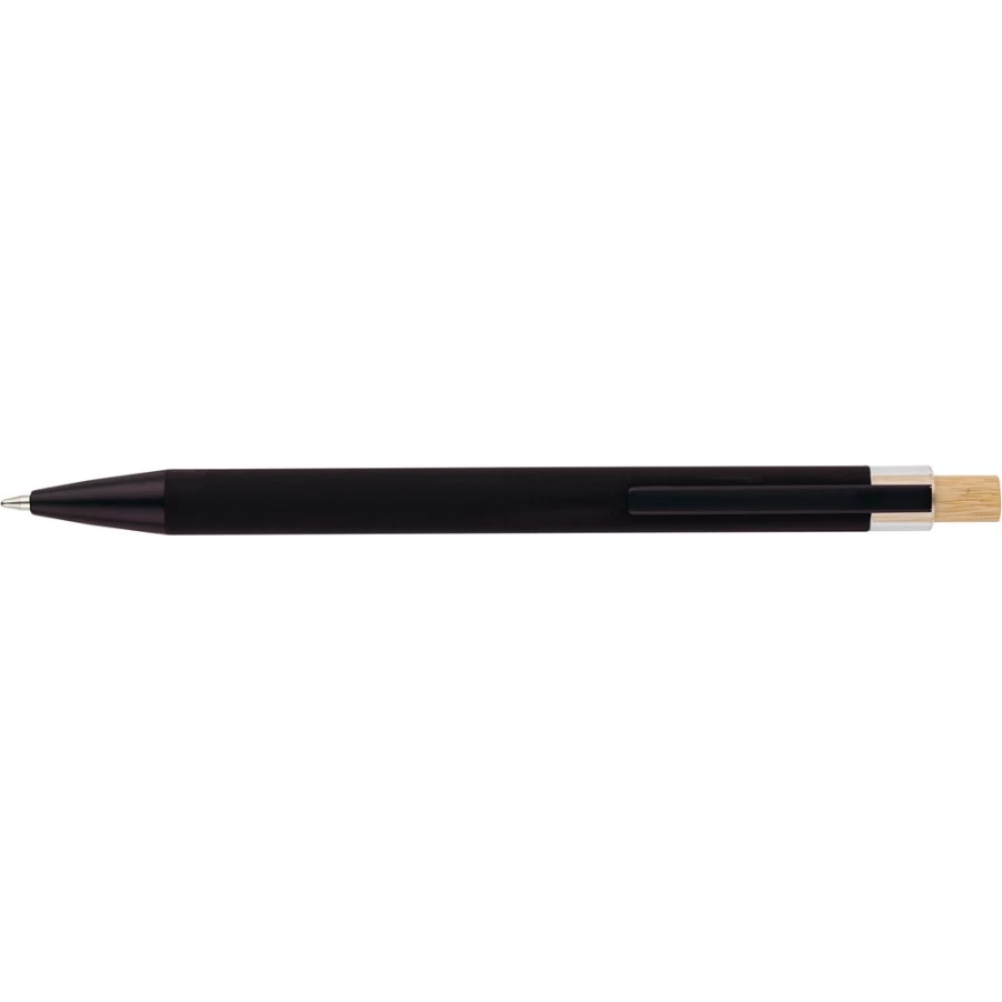 Długopis, bambusowy przycisk, metalowy klips, wkład w niebieskim kolorze, ikona recyklingu na produkcie, wystarcza na ok. 800 m pisania, produkt wykonany z ABS z recyklingu, aluminium i bambusa