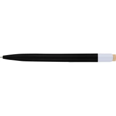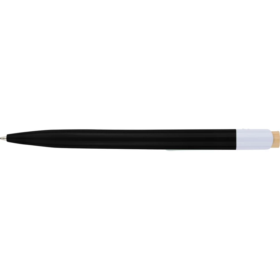 Długopis, bambusowy przycisk, metalowy klips, wkład w niebieskim kolorze, ikona recyklingu na produkcie, wystarcza na ok. 600 m pisania, produkt wykonany z ABS z recyklingu, aluminium i bambusa