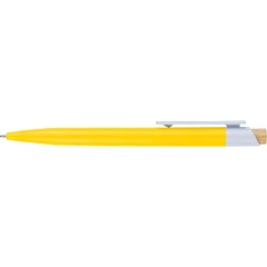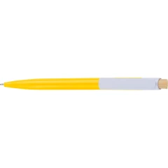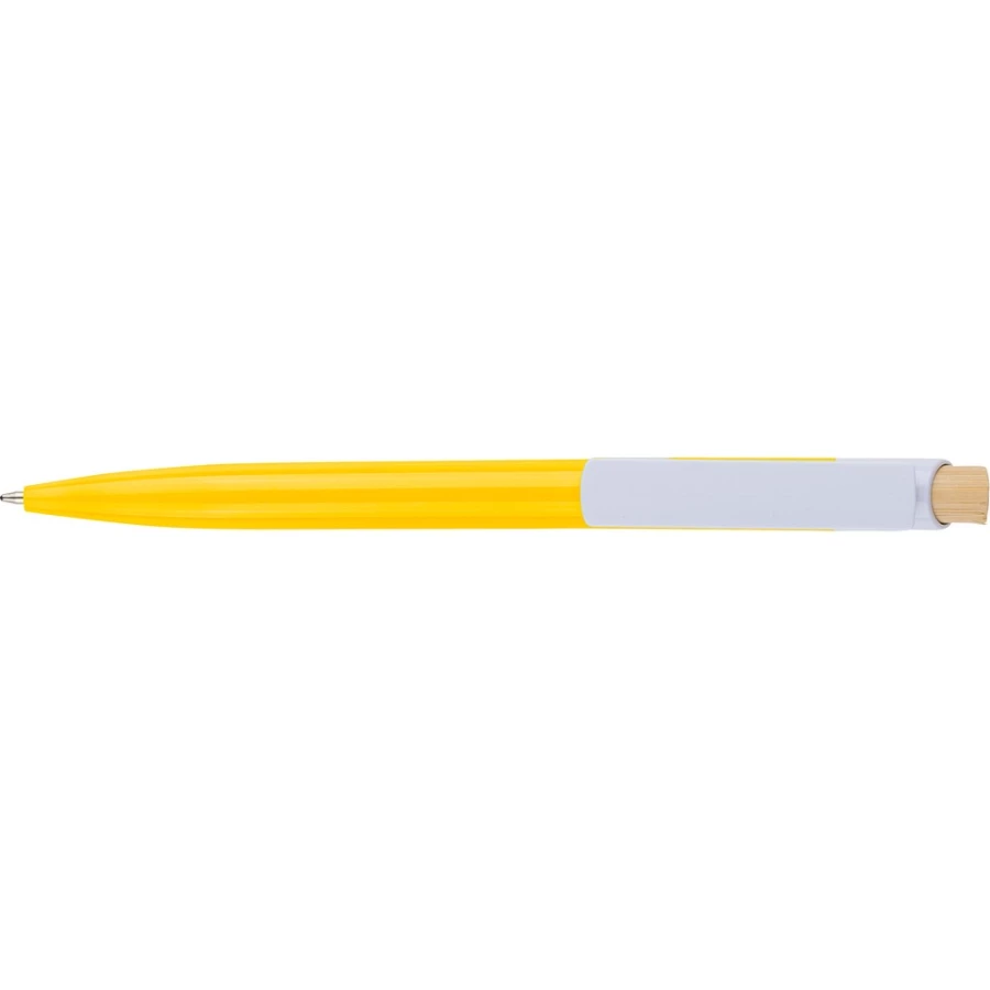Długopis, bambusowy przycisk, metalowy klips, wkład w niebieskim kolorze, ikona recyklingu na produkcie, wystarcza na ok. 600 m pisania, produkt wykonany z ABS z recyklingu, aluminium i bambusa