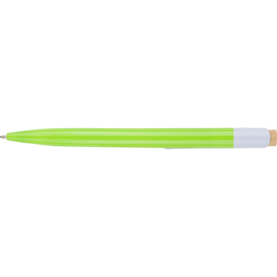 Długopis, bambusowy przycisk, metalowy klips, wkład w niebieskim kolorze, ikona recyklingu na produkcie, wystarcza na ok. 600 m pisania, produkt wykonany z ABS z recyklingu, aluminium i bambusa
