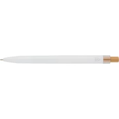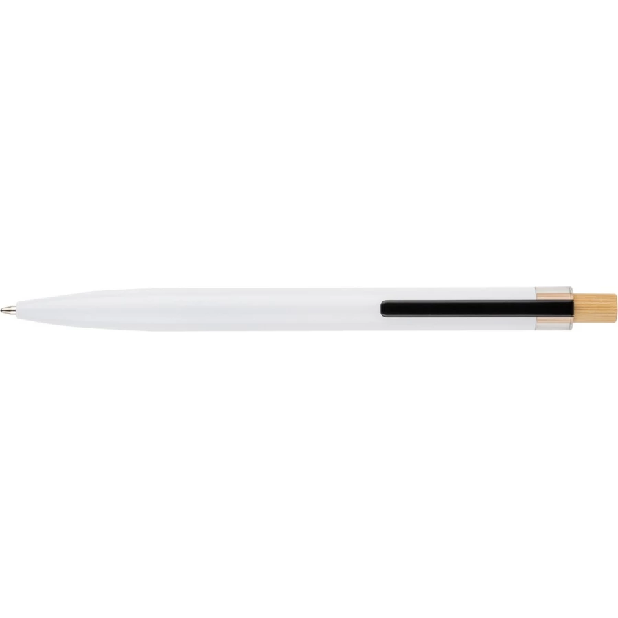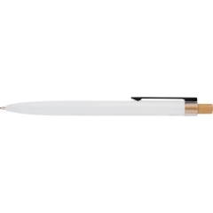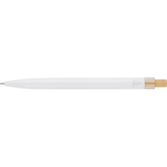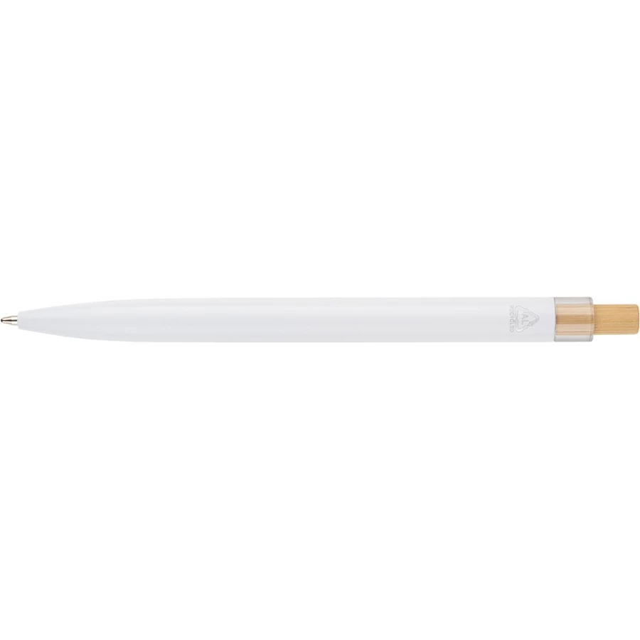 Długopis, wkład w niebieskim kolorze, wystarcza na ok. 700 m pisania, ikona recyklingu na produkcie, produkt wykonany z aluminium, RPET i z przyciskiem z bambusa