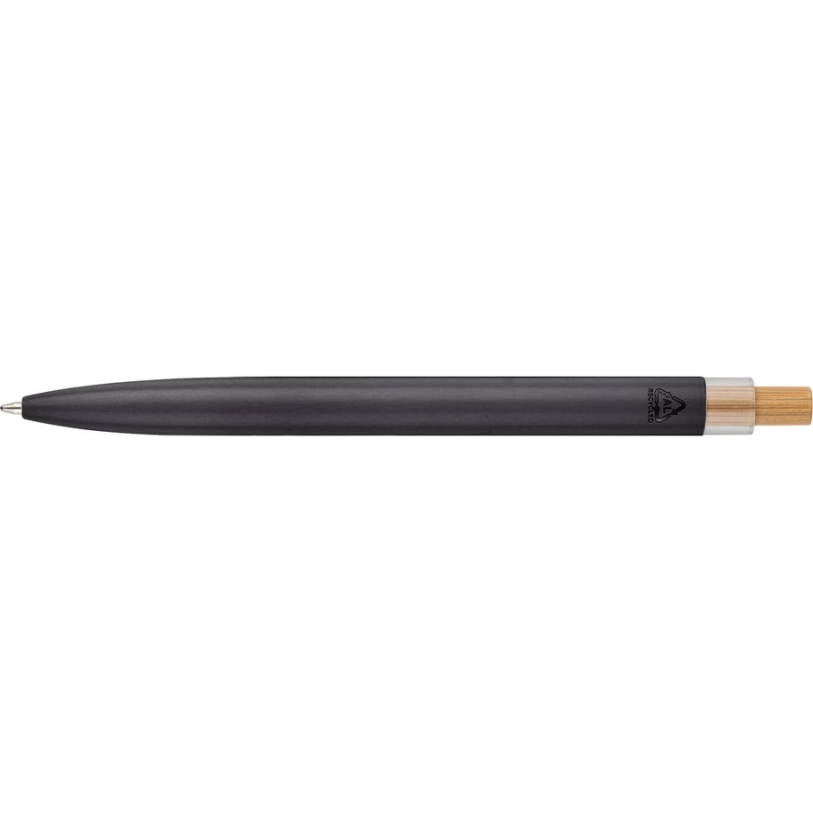 Długopis, wkład w niebieskim kolorze, wystarcza na ok. 700 m pisania, ikona recyklingu na produkcie, produkt wykonany z aluminium, RPET i z przyciskiem z bambusa