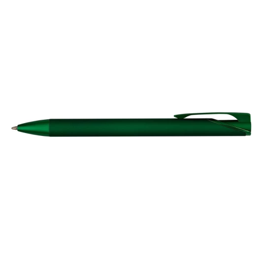 Długopis z kolorowym matowym trzonem i błyszczącymi elementami, wkład w niebieskim kolorze, czarne papierowe etui w komplecie, grawer ukazuje lustrzaną powierzchnię, produkt wykonany z metalu