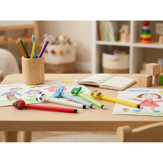 Długopis wymazywalny „zwierzątko” z kolorowym trzonem, występuje w 5 różnych wzorach sprzedawanych losowo: słoń, żyrafa, dinozaur, panda i biedronka
