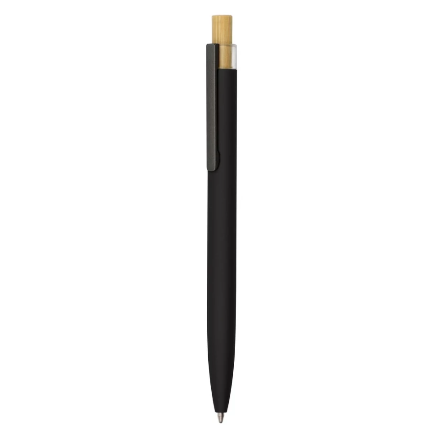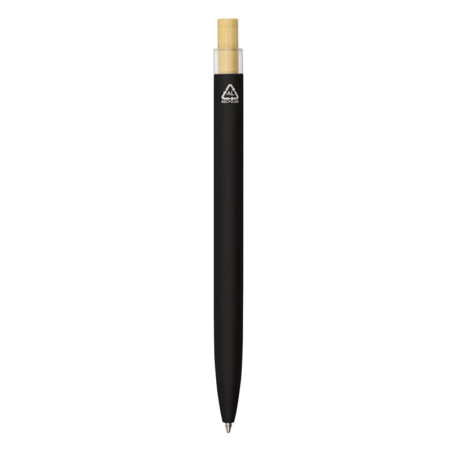 Długopis z kolorowym trzonem i elementami w szarym kolorze, posiada bambusowy przycisk, wkład w granatowym kolorze, produkt wykonany z aluminium z recyklingu, bambusa i RPET