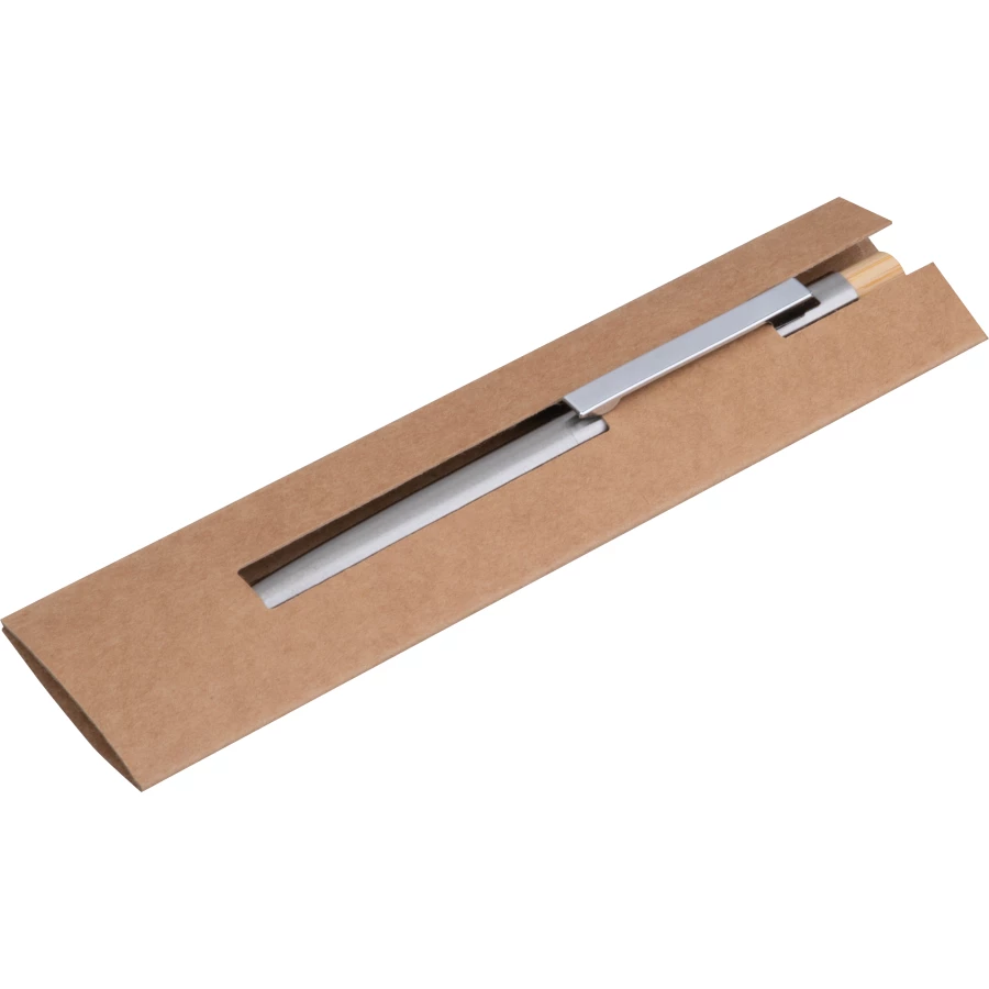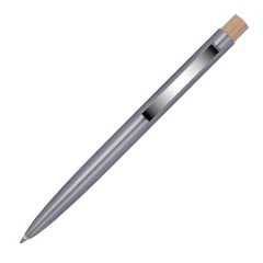 Długopis wykonany ze stali nierdzewnej z recyklingu, wyposażony w przycisk z bambusa oraz wkład o dużej pojemności piszący na niebiesko.