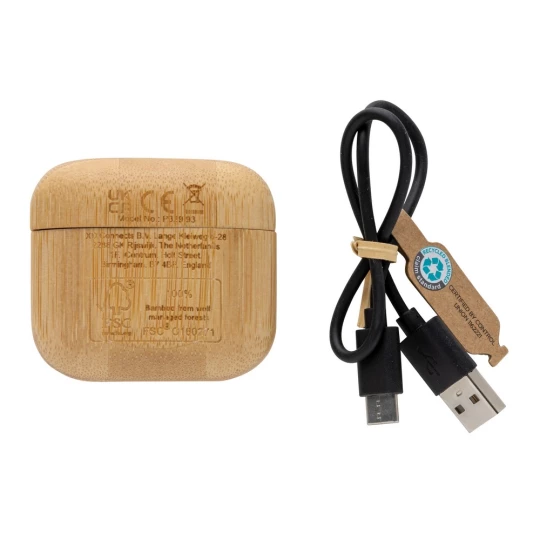 Douszne słuchawki bezprzewodowe TWS, BT 5.3, wbudowany mikrofon, funkcja odbierania połączeń, wykonane z ABS z recyklingu z certyfikatem RCS oraz bambusa z certyfikatem FSC®, całkowita zawartość materiałów z recyklingu obliczona na podstawie wagi całkowitej przedmiotu: 23%, automatyczne parowanie, etui 400 mAh pełniące funkcję stacji ładującej w komplecie, akumulator słuchawek 40 mAh umożliwia odtwarzanie muzyki na średnim poziomie głośności do 14 godzin, ponowne naładowanie za pomocą etui w 1 godzinę, zasięg do 10 metrów, różne rozmiary nakładek dousznych w komplecie, kabel z TPE z recyklingu w komplecie, w pudełku z papieru kraftowego z certyfikatem FSC® mix, ślad węglowy produktu: 0,44 kg CO2