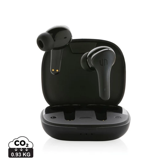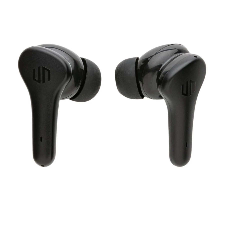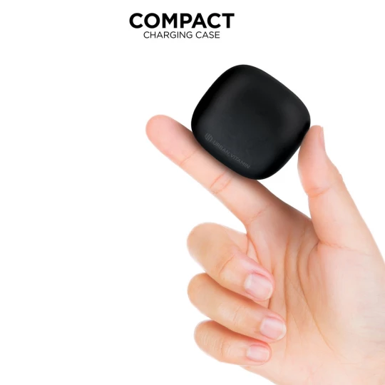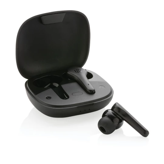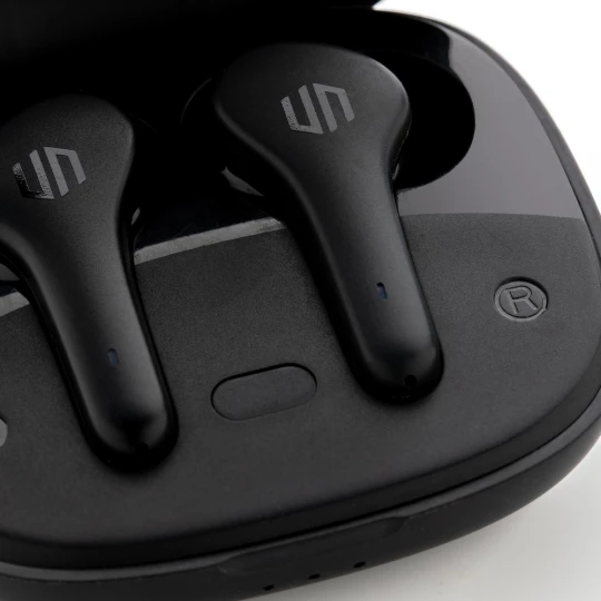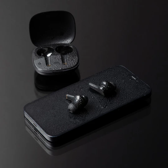 Bezprzewodowe słuchawki douszne z systemem redukcji szumów z otoczenia (ENC), który doskonale sprawdza się podczas rozmów telefonicznych, słuchawki wyposażone są w tryb niskiego opóźnienia (65 ms), dzięki któremu opóźnienie pomiędzy ekranem a dźwiękiem jest minimalizowane, wodoodporne IPX4 (całkowita ochrona przed spryskiwaniem i zachlapaniem wodą z różnych kierunków z natężeniem do 10 litrów na minutę), dotykowy panel sterowania, wbudowany mikrofon, funkcja odbierania połączeń, do 5 godzin odtwarzania na jednym ładowaniu, etui ładujące zapewnia 20 godzin odtwarzania, nie zawiera PVC, opakowanie nie zawiera plastiku, ślad węglowy produktu: 0,93 kg CO2