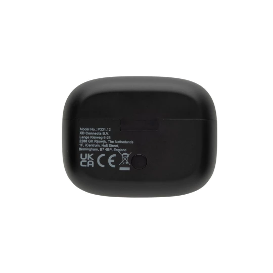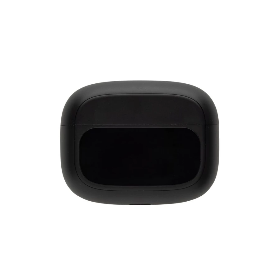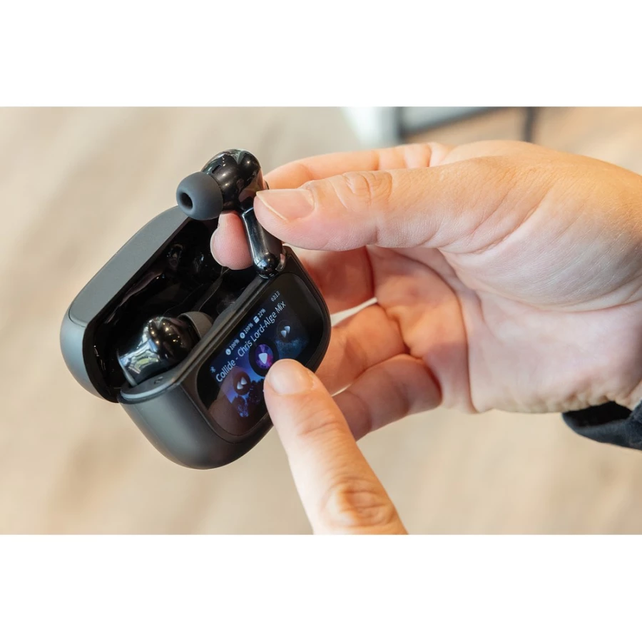 Bezprzewodowe słuchawki douszne z systemem aktywnej redukcji szumów (ANC), poziom redukcji szumów do 23 dB, BT 5.3, posiadają wbudowany ekran dotykowy TFT, który oferuje funkcje takie jak: przełączanie utworów, odbieranie połączeń, regulacja poziomu głośności i wiele innych, wodoodporne IPX4, wbudowany mikrofon, funkcja odbierania połączeń, do 6 godzin odtwarzania na jednym ładowaniu, ponowne naładowanie w etui ładującym w 1,5h, wykonane z ABS z recyklingu z certyfikatem RCS, w komplecie 3 pary nakładek w różnych rozmiarach, całkowita zawartość materiałów z recyklingu obliczona na podstawie wagi całkowitej przedmiotu: 43%, w pudełku z papieru kraftowego z certyfikatem FSC®