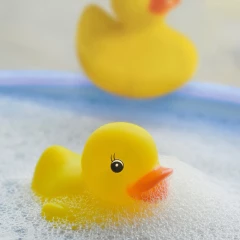 Żółta gumowa kaczuszka wykonana z PVC, idealna do zabaw w wodzie. 70 x 72 x 80 mm