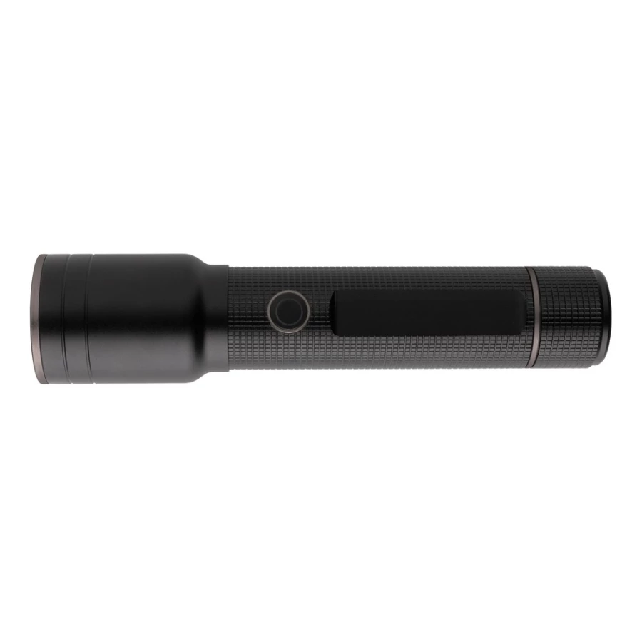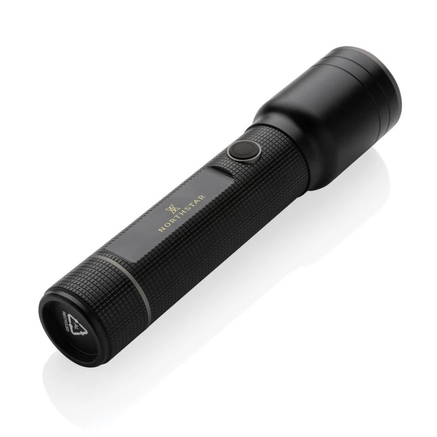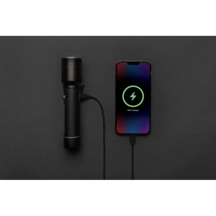 Latarka 10W o bardzo jasnym świetle, wodoodporna IP4, wiązka 1500 lumenów sięgająca do 800 m, wysokiej jakości żarówka z 5 trybami świecenia, w tym SOS, wbudowany akumulator 4000 mAh pozwala na około 10 godzin ciągłego świecenia, ładowana za pomocą USB, wykonana z aluminium z recyklingu z certyfikatem RCS, całkowita zawartość materiałów z recyklingu obliczona w oparciu o wagę całkowitą przedmiotu: 20%, w pudełku z papieru kraftowego