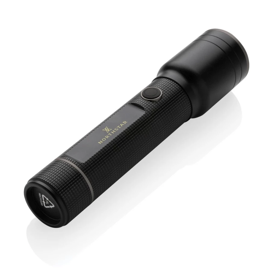 Latarka 10W o bardzo jasnym świetle, wodoodporna IP4, wiązka 1500 lumenów sięgająca do 800 m, wysokiej jakości żarówka z 5 trybami świecenia, w tym SOS, wbudowany akumulator 4000 mAh pozwala na około 10 godzin ciągłego świecenia, ładowana za pomocą USB, wykonana z aluminium z recyklingu z certyfikatem RCS, całkowita zawartość materiałów z recyklingu obliczona w oparciu o wagę całkowitą przedmiotu: 20%, w pudełku z papieru kraftowego z certyfikatem FSC® mix, ślad węglowy produktu: 4,89 kg CO2
