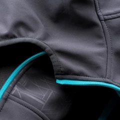 materiał: 94% poliester, 6% elastan (softshell) materiał podszewki: 100% poliester wodoodporność: 10 000 mm H2O oddychalność: 1 000 g H2O/m2 2 zapinane, przednie kieszenie elementy odblaskowe mikropolarowa podszewka zapinana na zamek stały kaptur