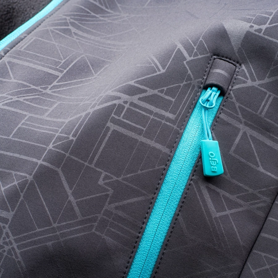 materiał: 94% poliester, 6% elastan (softshell) materiał podszewki: 100% poliester wodoodporność: 10 000 mm H2O oddychalność: 1 000 g H2O/m2 2 zapinane, przednie kieszenie elementy odblaskowe mikropolarowa podszewka zapinana na zamek stały kaptur