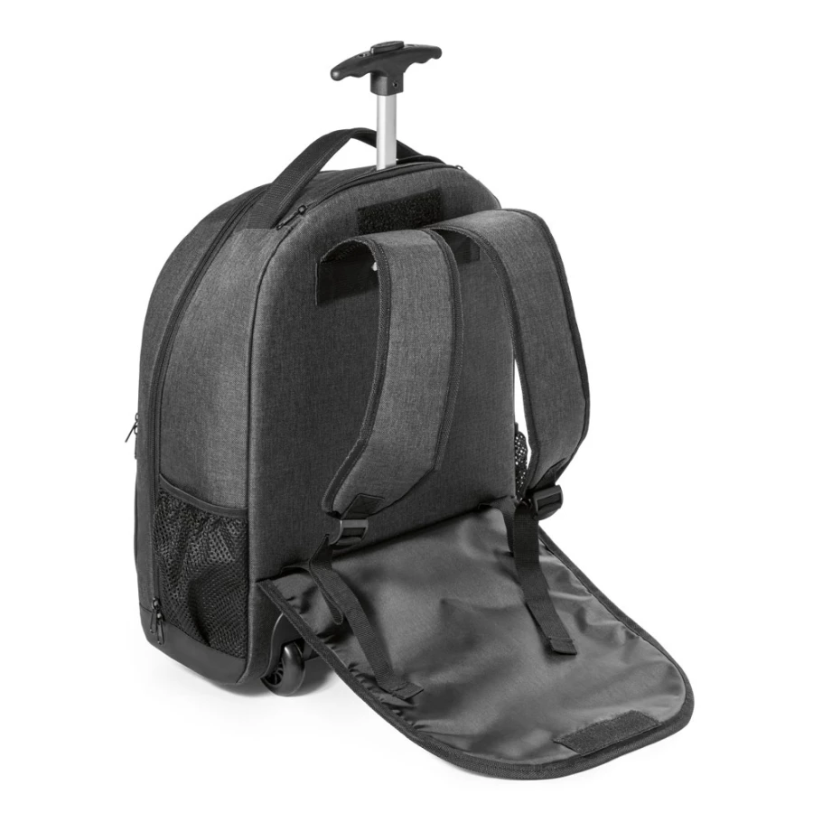 Plecak na laptopa z kółkami, który dostosowuje się do różnych sytuacji w codziennym życiu. Jako plecak zapewnia większą mobilność, a jako torba na kółkach oferuje większą wygodę podczas pokonywania dłuższych dystansów. Zawiera zdejmowaną metalową płytkę z magnesem, która ułatwia personalizację.Materiał zewnętrzny: poliester o wysokiej gęstości 600DMateriał wewnętrzny: poliester 210DKieszeń na komputer: 15.6 calaPojemność (l): 21Komory: 1 komora głównaKieszenie zewnętrzne: 2 przednie kieszenie zapinane na zamek błyskawiczny i 2 boczne kieszenie z siatkiDodatkowe cechy: wyściełana osłona kółek, wysuwana metalowa rączka, zdejmowana metalowa płytka do personalizacjiWymiary: 340 x 430 x 170 mm | Talerz: 50 x 20 mm