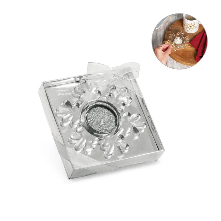 Świeca w szklanej podstawce w kształcie płatka śniegu. Dołączone pudełko prezentowe. Pudełko: 123 x 123 x 30 mm