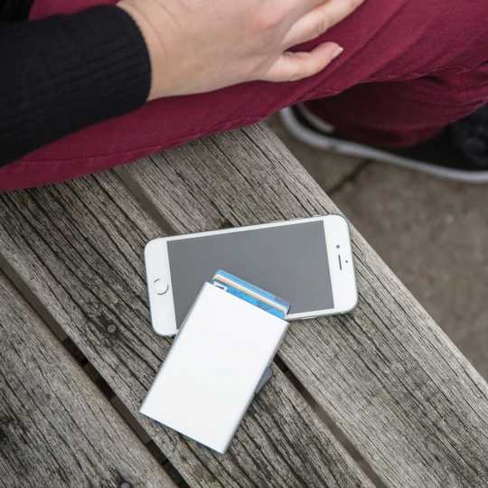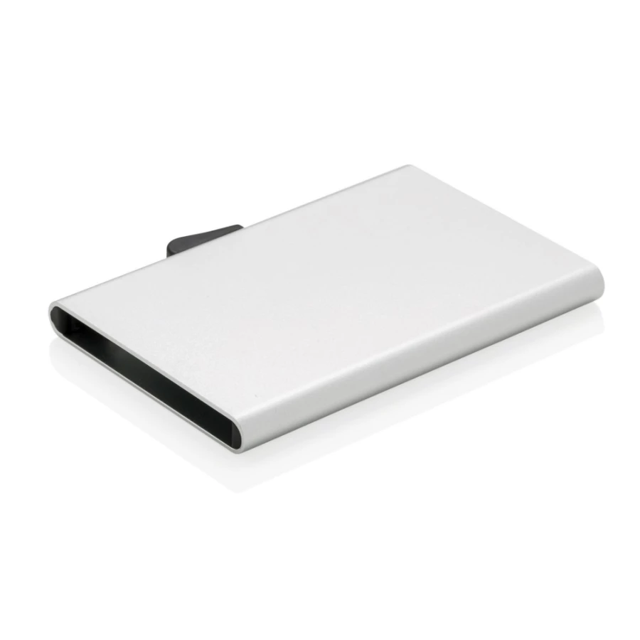 Solidne etui na karty kredytowe C-Secure z ochroną RFID, mieści do 7 kart lub do 5 z tłoczeniem, posiada suwak boczny do wysuwania kart, wykonane z aluminium, ślad węglowy produktu: 0,65 kg CO2