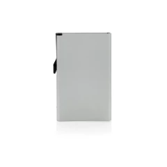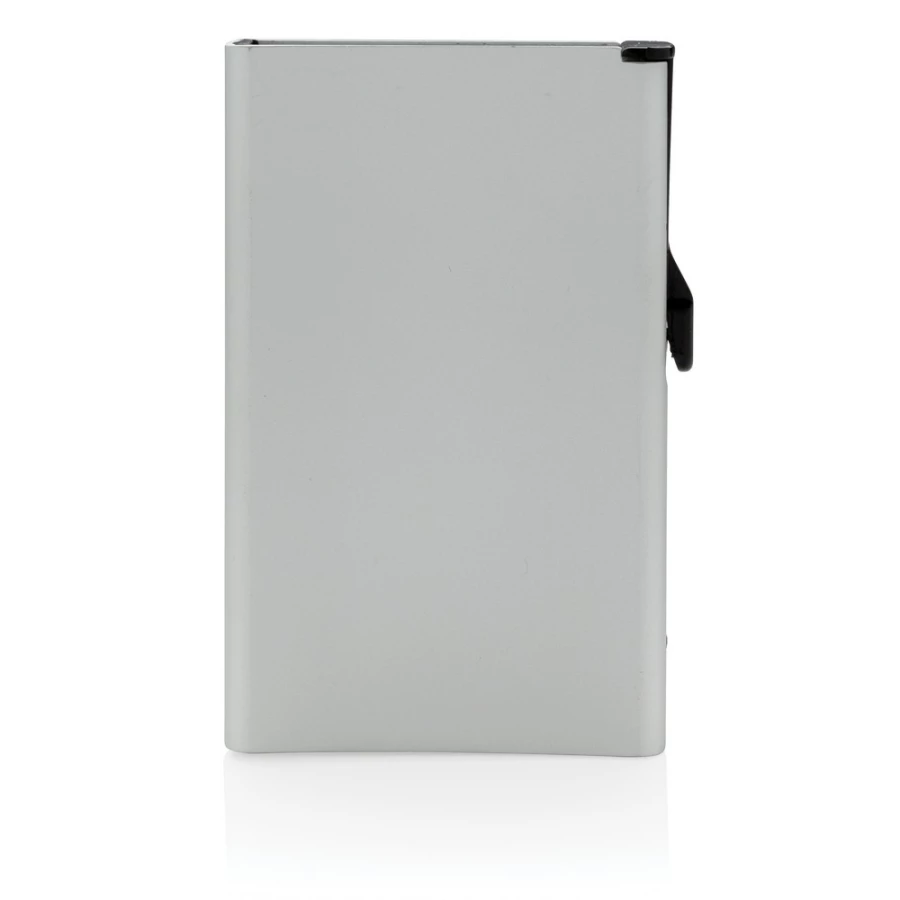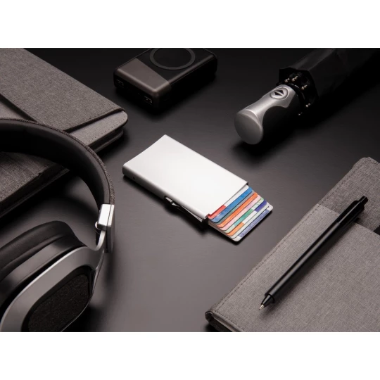 Etui na karty kredytowe z ochroną RFID, wykonane z wytrzymałego aluminium, mieści do 10 kart lub do 6 z tłoczeniem, posiada suwak boczny do wysuwania kart, ślad węglowy produktu: 0,67 kg CO2