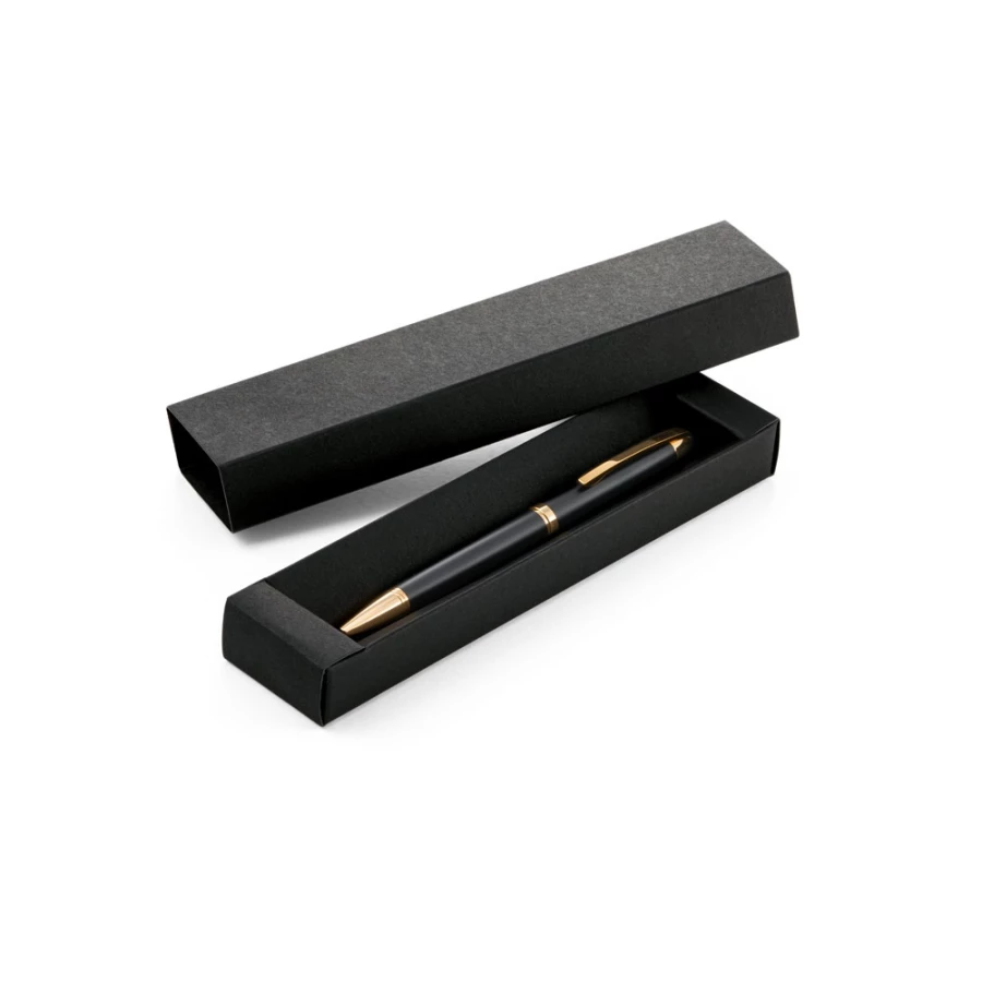 Metalowy długopis z mechanizmem obrotowym, klipsem i złotymi detalami. Niebieski tusz. Dostarczany w pudełku z papieru kraftowego. ø11 x 139 mm | Pudełko: 180 x 43 x 22 mm