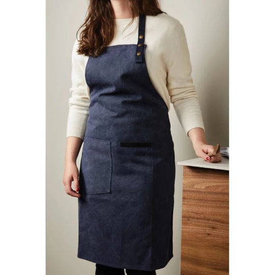 Fartuch kuchenny, wykonany z mieszanki 60% bawełny i 40% poliestru pochodzących z recyklingu, kieszeń z przodu, regulowany pasek