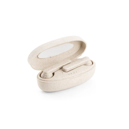 Bezprzewodowe słuchawki z mikrofonem i etui ładującym z wskaźnikiem stanu baterii. Każda słuchawka posiada diodę LED, która aktywuje się podczas użytkowania. Ponieważ produkt jest wykonany z naturalnych materiałów, kolor produktu oraz wynik drukowania mogą się różnić w zależności od produktu.Materiał: PP, włókno słomy pszenicznejTransmisja bezprzewodowa: BT v5'0Pojemność: słuchawki 40 mAh, etui ładujące 300 mAhPrzybliżona żywotność baterii: słuchawki 3 godziny, łącznie 10 godzinPrzybliżony czas ładowania: 2 godzinyPasmo przenoszenia: 20–20 kHzStosunek sygnału do szumu: 90 dBCzułość: 95 dB +/- 3 dBImpedancja: 32 Ω, średnica głośnika: 10 mmW zestawie: kabel USB-A / USB-COpakowanie: papierowe pudełko prezentowe typu kraftWymiary: 80 x 38 x 32 mm