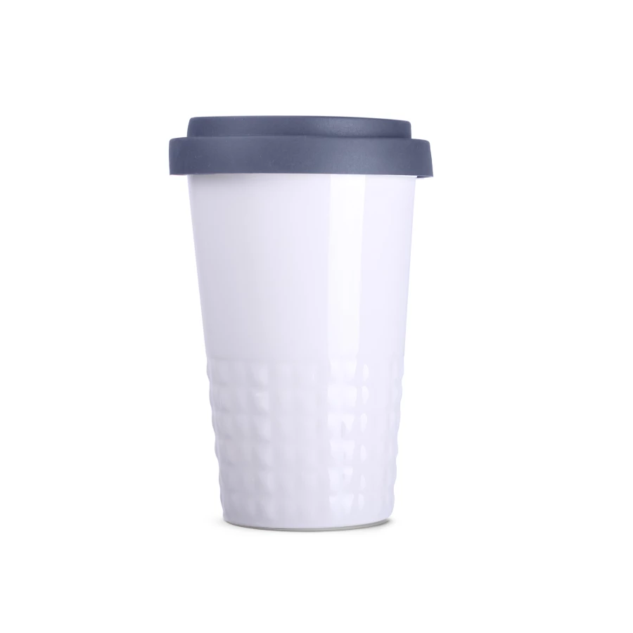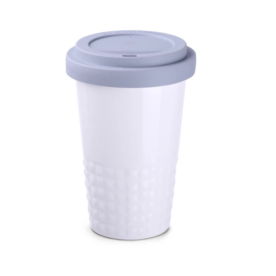 Designerski kubek mobilny wykonany z porcelany. Posiada charakterystyczne wykończenie dolnej części w postaci wypustek. Model skierowany dla osób aktywnych, miłośników wycieczek i podróży. Dzięki rzadko spotykanej, wewnętrznej strukturze podwójnych ścianek z porcelany charakteryzuje się podwyższonym poziomem izolacji termicznej. Posiada przykrywkę dostępną w 8 kolorach: biały, pomarańczowym, czerwonym, zielonym, granatowym, brązowym, czarnym i szarym.