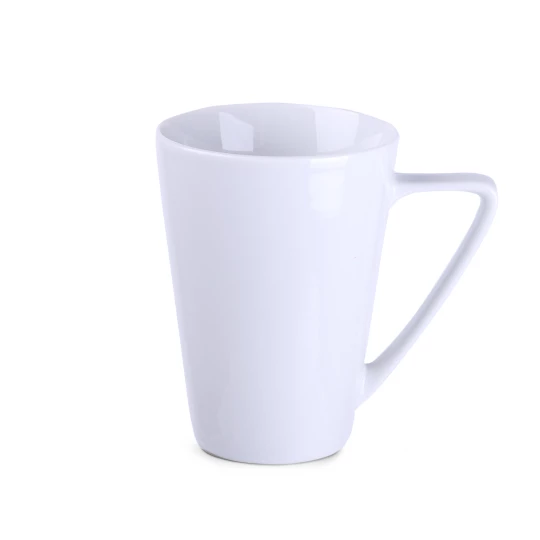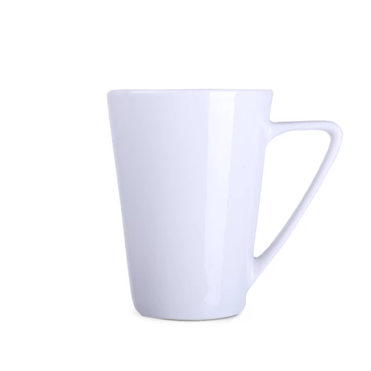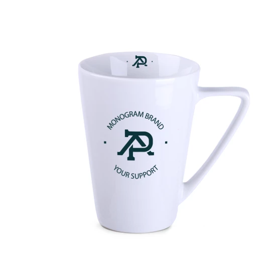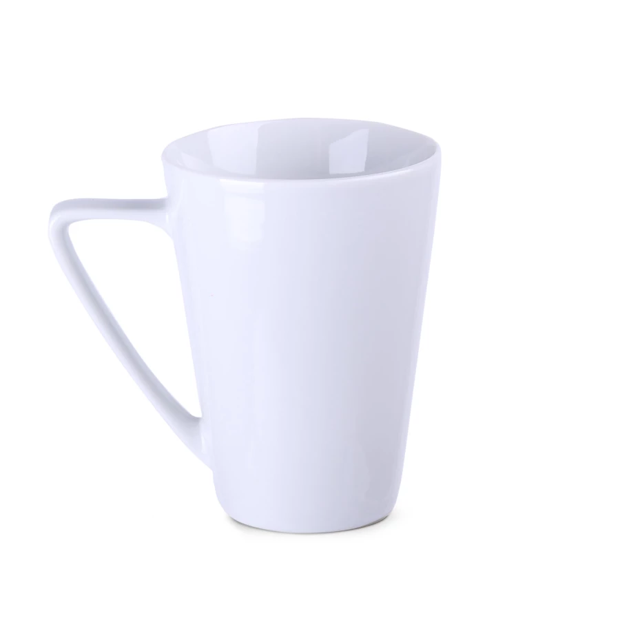 Pojemny kubek o geometrycznym kształcie korpusu i ucha. Wykonany z wysokiej jakości porcelany. Idealny do nanoszenia obszernych zdobień.