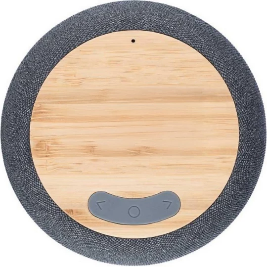 Głośnik bezprzewodowy mocy wyjściowa 5W, wejście DC 5 V, wbudowany akumulator 1200 mAh, działa w odległości 15-20 metrów od źródła sygnału, stosunek sygnału do szumu 87 dB, częstotliwość 100 Hz-20 K Hz, kabel ładujący o długości 50 cm typu C w zestawie, 6 godzin czasu gry, BT 5.2, zapakowany w brązowy kartonik, produkt wykonany z ABS i bambusa