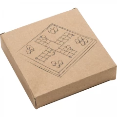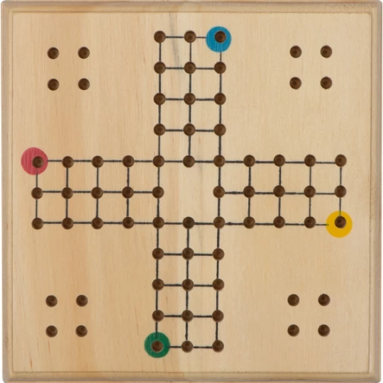 Plansza do gry w chińczyka wykonana z drewna. Pionki można zaczepiać o planszę, co ułatwia grę podczas podróży.