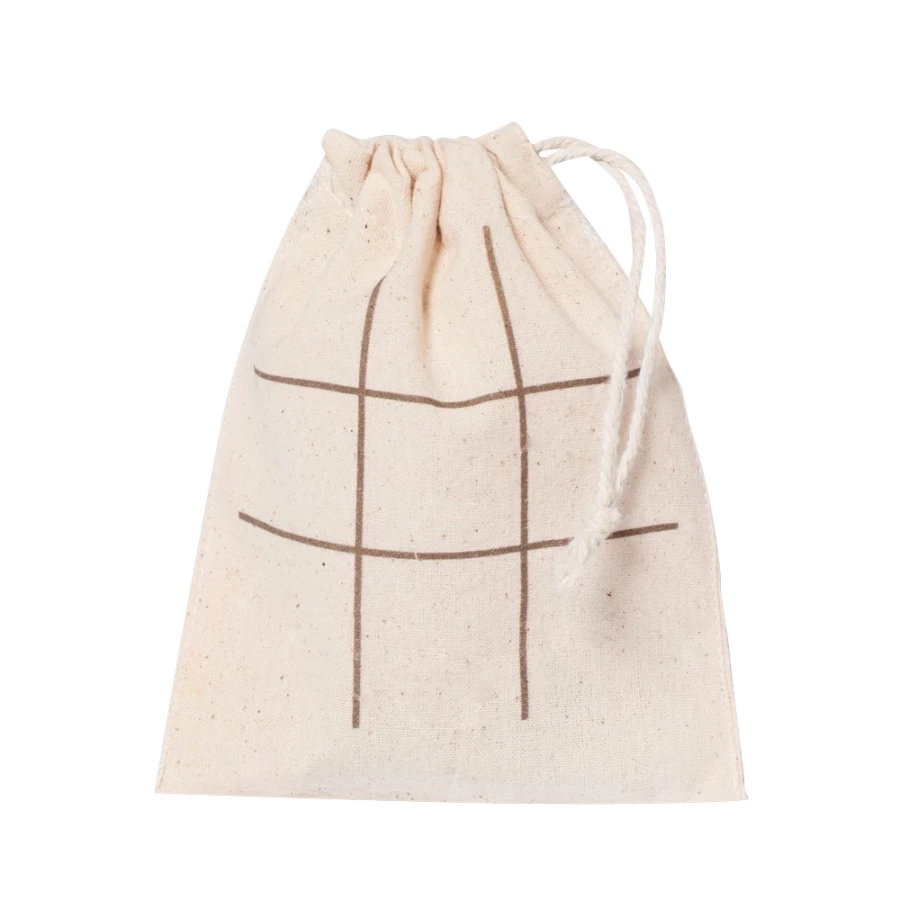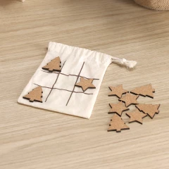 Gra "kółko i krzyżyk" ze świątecznym wzorem, posiada 5 żetonów w kształcie choinki oraz 5 żetonów w kształcie gwiazdy, w komplecie bawełniany woreczek pełniący funkcję planszy do gry, produkt wykonany z korka