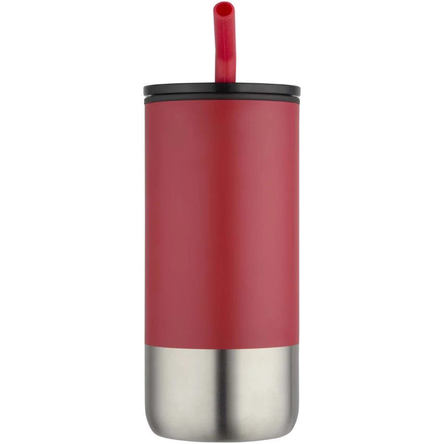 Ten kubek termiczny o podwójnych ściankach jest wyposażony w słomkę ze stali nierdzewnej z recyklingu, zakończoną silikonową końcówką zapewniającą wygodę użytkowania. Wewnętrzna ścianka jest wykonana z polipropylenu, a ścianka zewnętrzna ze stali nierdzewnej z recyklingu z certyfikatem RCS. Przesuwana pokrywa wykonana z tworzywa PS i plastiku ABS w połączeniu z matową powłoką nadaje kubkowi eleganckie wykończenie. Pojemność: 480 ml.