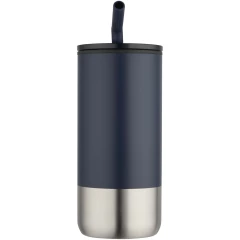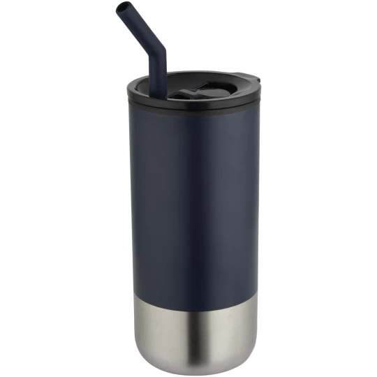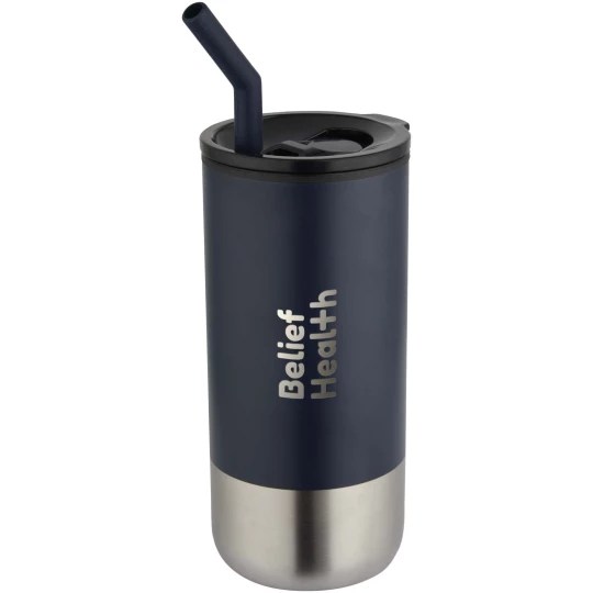 Ten kubek termiczny o podwójnych ściankach jest wyposażony w słomkę ze stali nierdzewnej z recyklingu, zakończoną silikonową końcówką zapewniającą wygodę użytkowania. Wewnętrzna ścianka jest wykonana z polipropylenu, a ścianka zewnętrzna ze stali nierdzewnej z recyklingu z certyfikatem RCS. Przesuwana pokrywa wykonana z tworzywa PS i plastiku ABS w połączeniu z matową powłoką nadaje kubkowi eleganckie wykończenie. Pojemność: 480 ml.