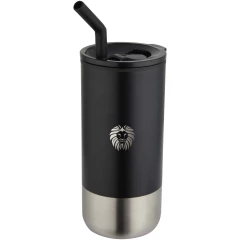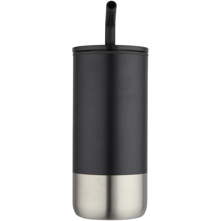Ten kubek termiczny o podwójnych ściankach jest wyposażony w słomkę ze stali nierdzewnej z recyklingu, zakończoną silikonową końcówką zapewniającą wygodę użytkowania. Wewnętrzna ścianka jest wykonana z polipropylenu, a ścianka zewnętrzna ze stali nierdzewnej z recyklingu z certyfikatem RCS. Przesuwana pokrywa wykonana z tworzywa PS i plastiku ABS w połączeniu z matową powłoką nadaje kubkowi eleganckie wykończenie. Pojemność: 480 ml.