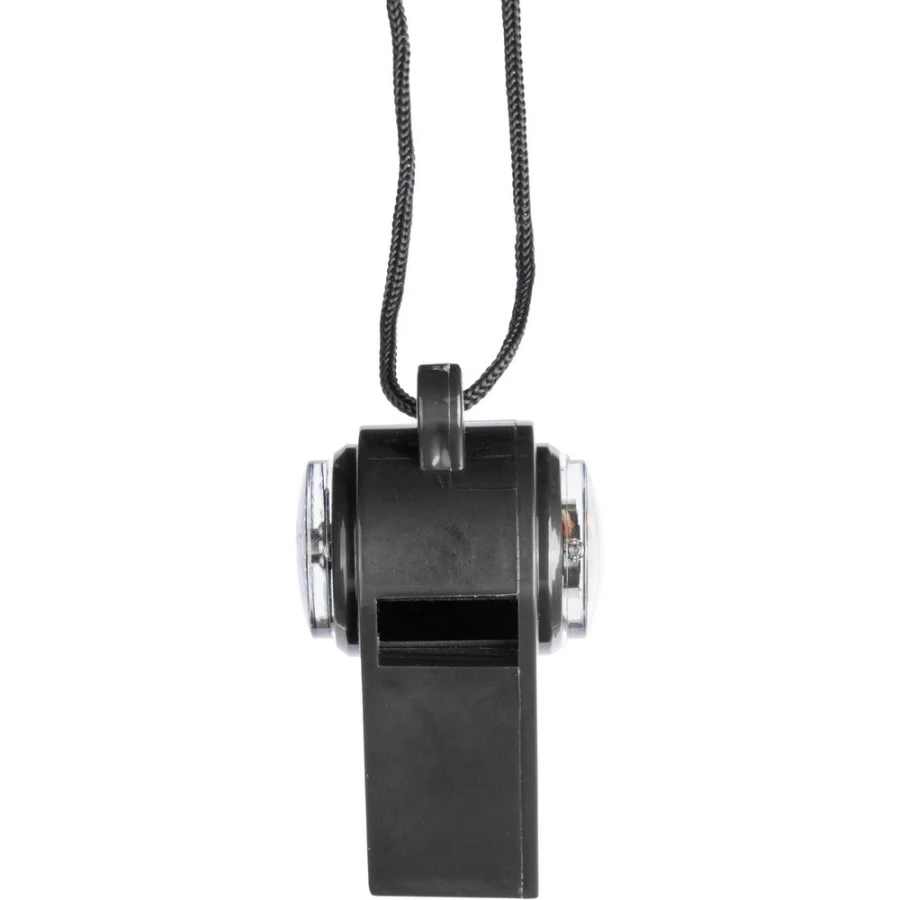 Gwizdek z kompasem i termometrem (w stopniach Celsjusza), zawiera sznurek na szyję o długości 100 cm (z każdej strony 50 cm) z klamrą zabezpieczającą, wydaje dźwięk 90 dB, zapakowany w brązowy kartonik, produkt wykonany z PP