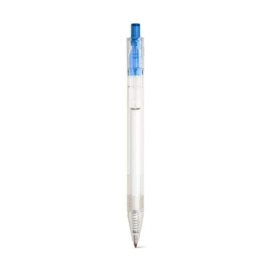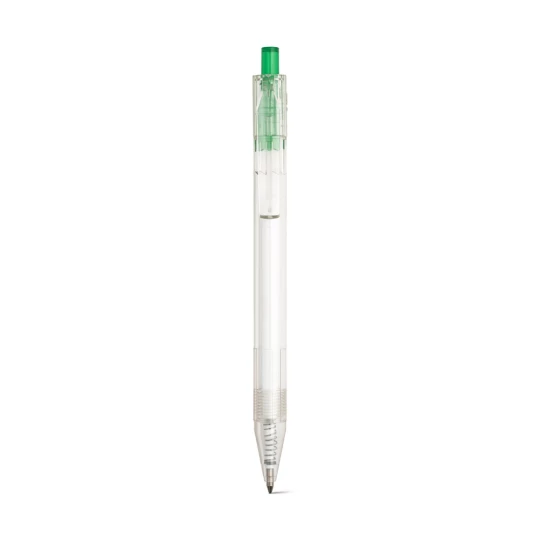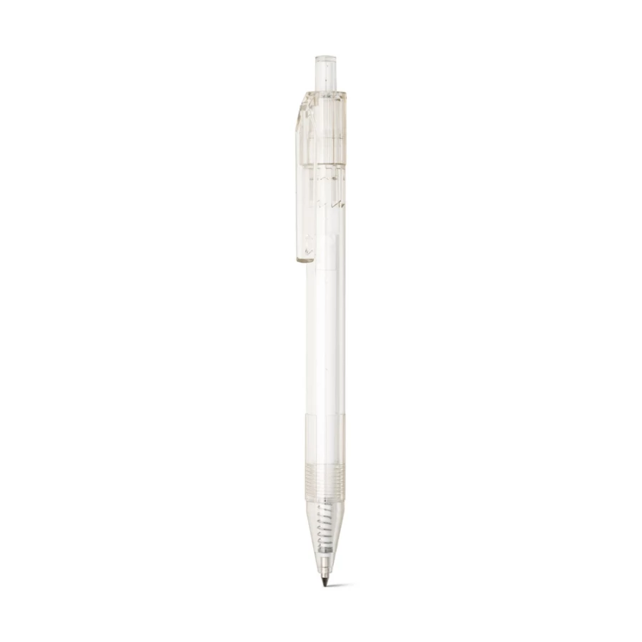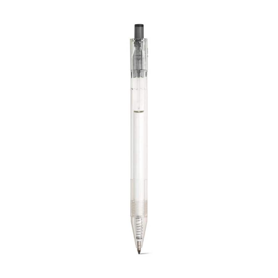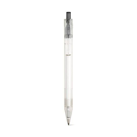 Długopis z przezroczystego materiału z 100% rPET z kolorowym przyciskiem. Czarny wkład. ø11 x 142 mm