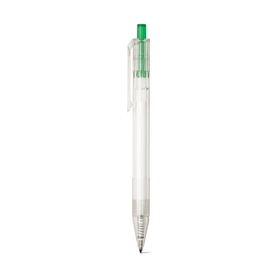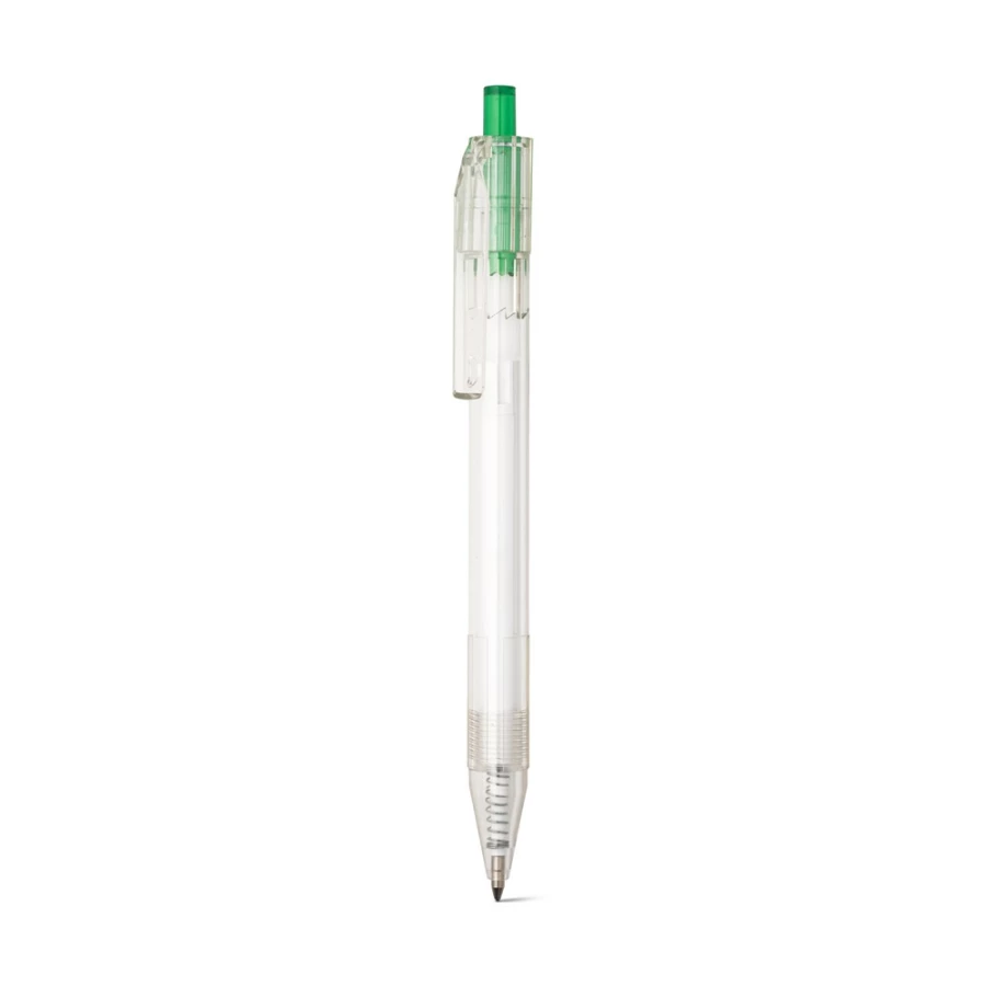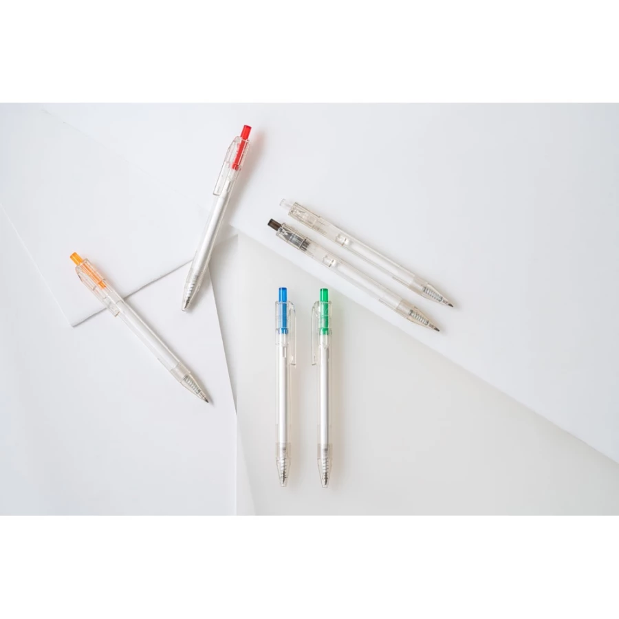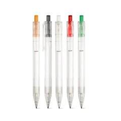 Długopis z przezroczystego materiału z 100% rPET z kolorowym przyciskiem. Czarny wkład. ø11 x 142 mm