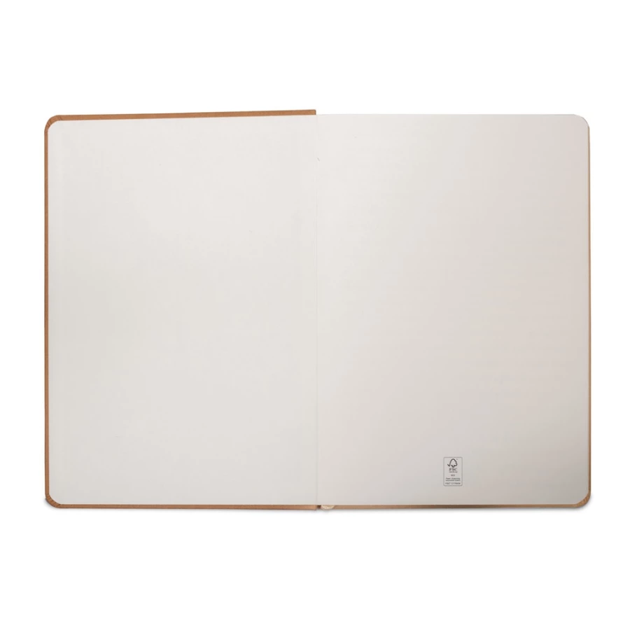 Notatnik A5 ze sztywną okładką ze wodoodporny papieru kraft i zaokrąglonymi rogami. Zawiera 160 stron w linie na papierze w kolorze kości słoniowej, wykonanym z certyfikowanego materiału FSC™ i innych kontrolowanych materiałów, taśmę oddzielającą i gumkę do zamykania notatnika. 147 x 210 mm