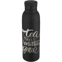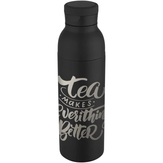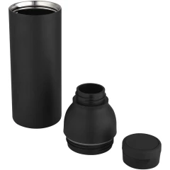 Dwuścienna, izolowana próżniowo butelka na wodę ze stali nierdzewnej z certyfikatem RCS, wyposażona w dyskretny silikonowy uchwyt wbudowany w pokrywkę. Dwuczęściowa konstrukcja ułatwia czyszczenie, a wytrzymała powłoka z lakieru proszkowego i miedziane pokrycie zapewniają długotrwałą wydajność. Zapakowana w pudełko upominkowe wykonane z kartonu z recyklingu. Pojemność: 650 ml.