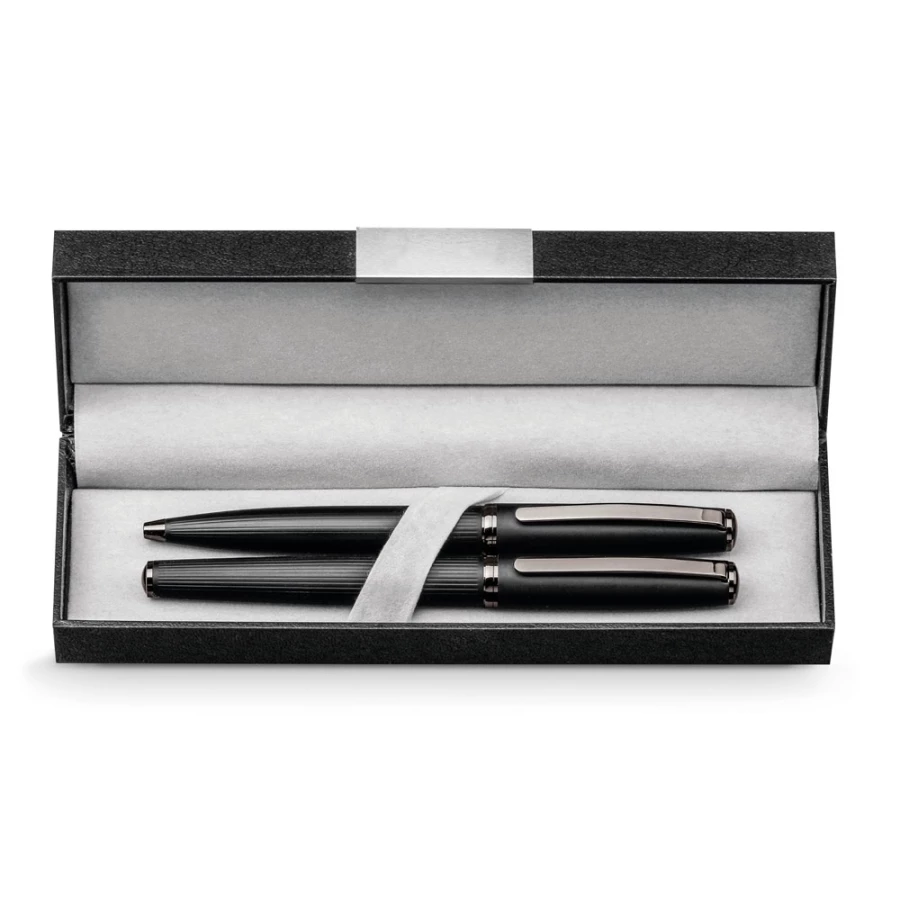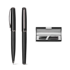 Zestaw - długopis z mechanizmem obrotowym i metalowe pióro kulkowe, oba z klipsem. Niebieski tusz. Dostarczany w wyściełanym pudełku upominkowym. Długopis: ø13 x 137 mm | Roller: ø13 x 137 mm | Pudełko: 180 x 30 x 56 mm