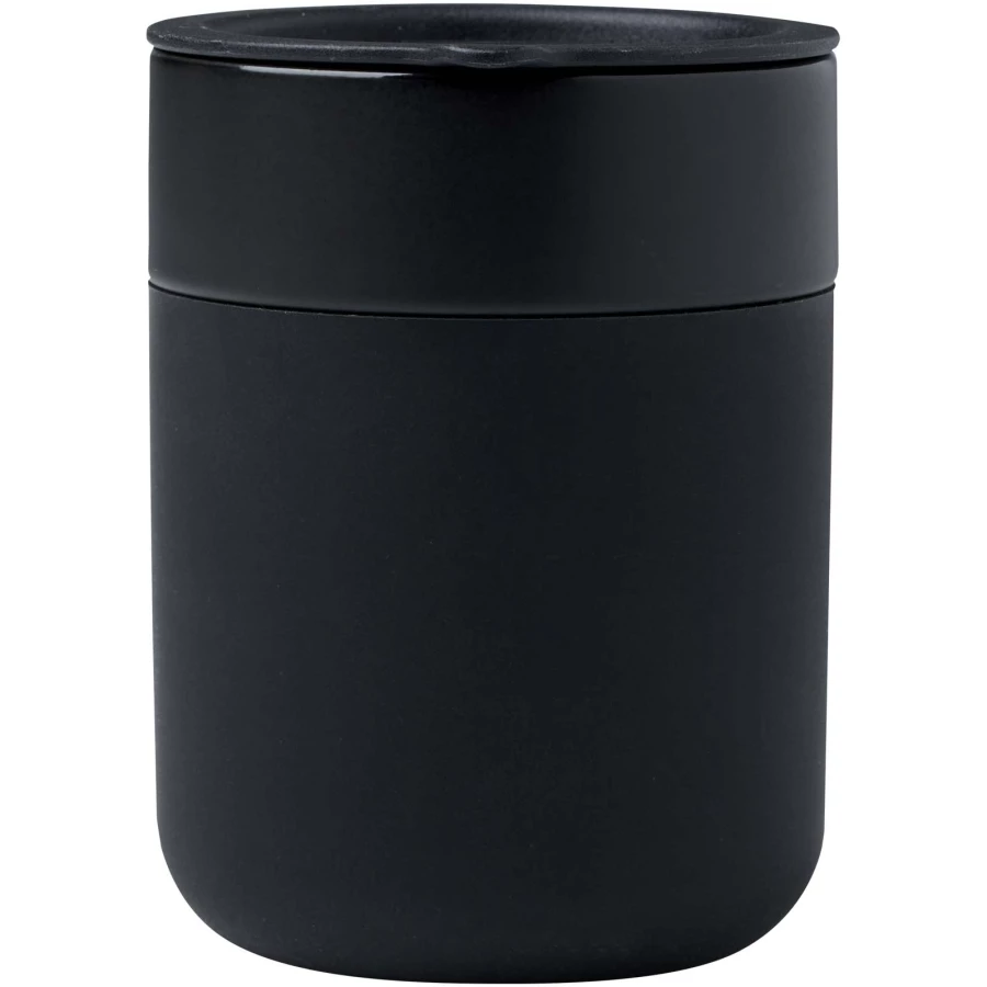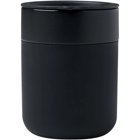 Java jednościenny kubek ceramiczny o prostej i praktycznej konstrukcji do codziennego użytku, jest wyposażony w silikonową osłonę zapewniającą wygodny chwyt. Wieczko zapobiegające rozlaniu płynu. Pojemność: 330 ml.
