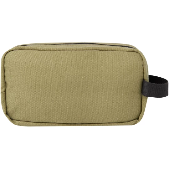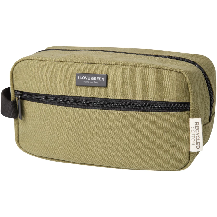 Kosmetyczka wykonana z płótna z recyklingu z certyfikatem GRS, z podszewką z RPET z certyfikatem GRS. Posiada zapinaną na zamek przednią kieszeń i jedną zapinaną na zamek komorę główną z kieszeniami organizacyjnymi oraz wygodną taśmę. Ozdobna metalowa płytka może sprawić, że logo będzie świecić dzięki subtelnemu i matowemu wykończeniu. Pojemność: 3,5 litrów.