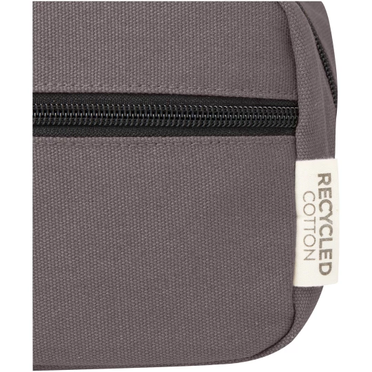 Kosmetyczka wykonana z płótna z recyklingu z certyfikatem GRS, z podszewką z RPET z certyfikatem GRS. Posiada zapinaną na zamek przednią kieszeń i jedną zapinaną na zamek komorę główną z kieszeniami organizacyjnymi oraz wygodną taśmę. Ozdobna metalowa płytka może sprawić, że logo będzie świecić dzięki subtelnemu i matowemu wykończeniu. Pojemność: 3,5 litrów.