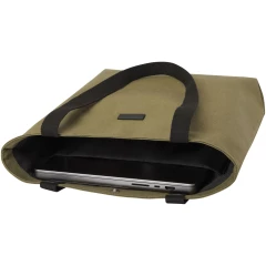 Torba na zakupy wykonana z płótna z recyklingu z certyfikatem GRS, z podszewką z RPET z certyfikatem GRS. Ta uniwersalna torba na zakupy posiada wyściełaną przegrodę na 15-calowego laptopa i dwie kieszenie wewnętrzne na telefon, portfel lub akcesoria, a także łatwe zapięcie na guzik i wygodne bawełniane uchwyty. Ozdobna metalowa płytka może sprawić, że logo będzie świecić dzięki subtelnemu i matowemu wykończeniu.