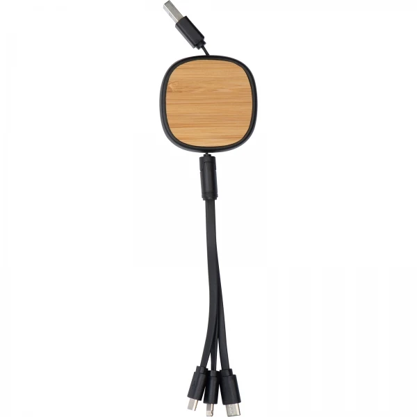 Kabel do ładowania z bambusową obudową, końcówki: USB, microUSB, typ C i lightning.