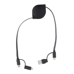 Zwijany kabel do ładowania z 4 końcówkami: USB, 2 x typu C i 2 w 1 (micro USB oraz kompatybilną z urządzeniami iOS), obudowa wykonana z ABS pochodzącego z recyklingu, posiadają certyfikat RCS (Recycled Claim Standard), który jest stosowany gdy produkt jest wykonany częściowo lub w całości z materiałów pochodzących z recyklingu, nie zawiera PVC, ślad węglowy produktu: 0,16 kg CO2
