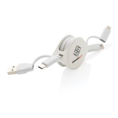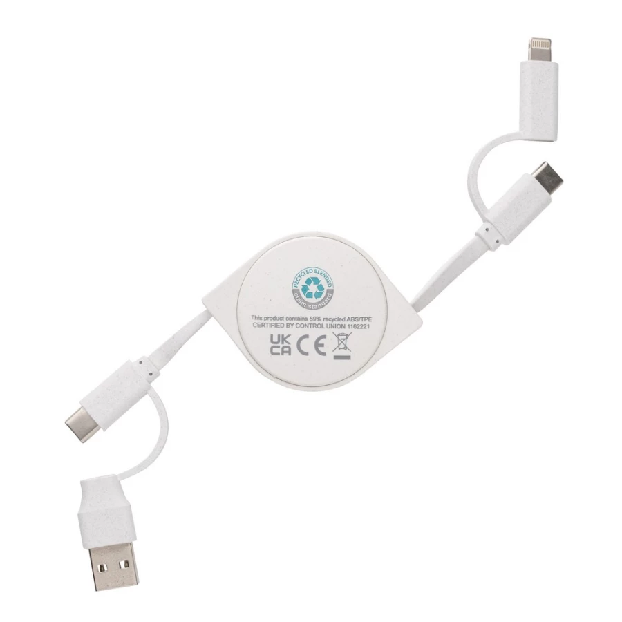 Zwijany kabel do ładowania z 4 końcówkami: USB, 2 x typu C i 2 w 1 (micro USB oraz kompatybilną z urządzeniami iOS), obudowa wykonana z ABS pochodzącego z recyklingu, posiadają certyfikat RCS (Recycled Claim Standard), który jest stosowany gdy produkt jest wykonany częściowo lub w całości z materiałów pochodzących z recyklingu, nie zawiera PVC, ślad węglowy produktu: 0,16 kg CO2
