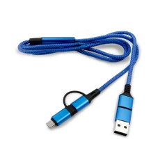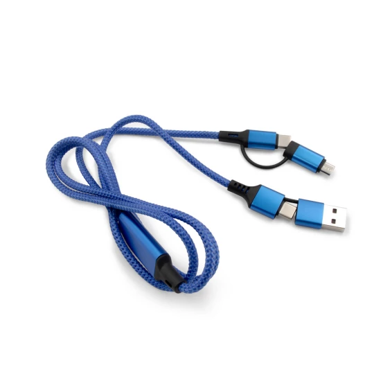 Kabel do ładowania i synchronizacji danych z dedykowanym miejscem pod znakowanie i 4 końcówkami: 2x USB-C, USB oraz micro USB, co umożliwia ładowanie urządzeń o różnych złączach jednym kablem, końcówki USB-C do USB-C umożliwiają szybkie ładowanie, moc maksymalna ładowania USB C do USB C 60W, pozostałe złącza 10W, długość kabla wynosi 100 cm, produkt wykonany z ABS i nylonu