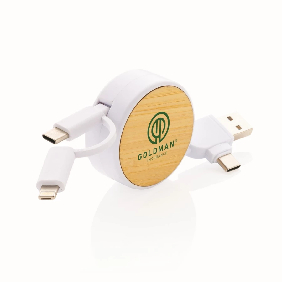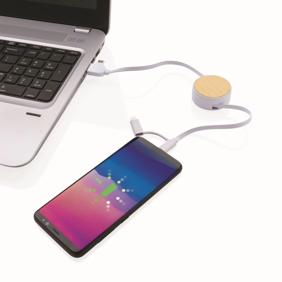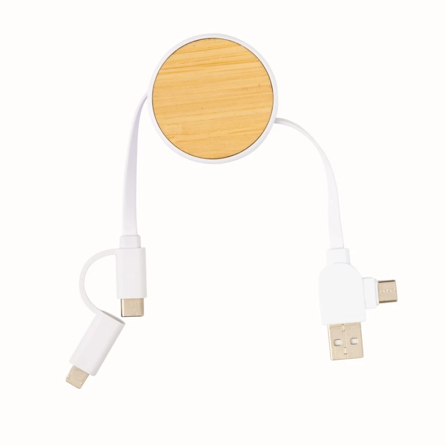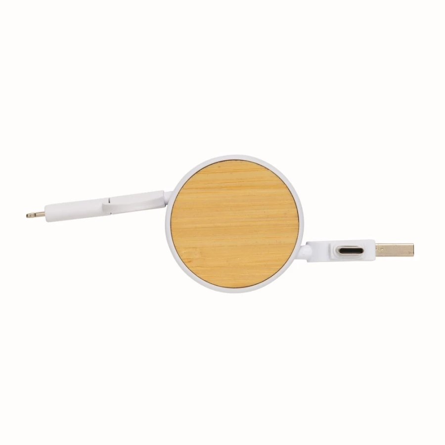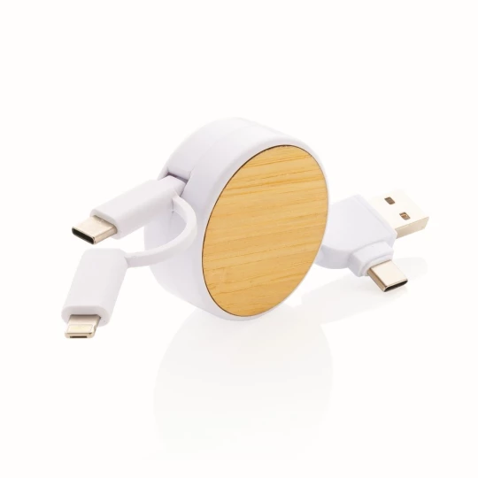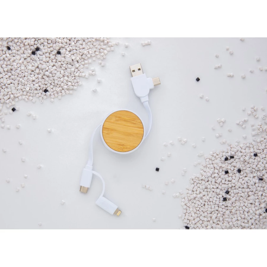 Kabel do ładowania, końcówki: USB, 2 x USB C, micro USB, iOS, obudowa wykonana z bambusa z certyfikatem FSC i ABS z recyklingu, kabel wykonany z TPE z recyklingu, kabel i obudowa posiadają certyfikaty RCS, długość 100 cm, nie zawiera PVC, ślad węglowy produktu: 0,19 kg CO2