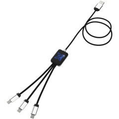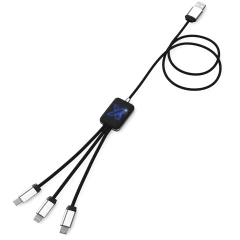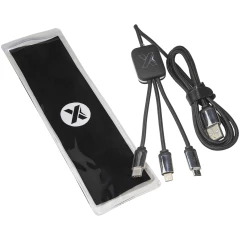 Kabel do ładowania z podświetlanym logo z gumowanym i metalowym wykończeniem wyposażony w trzy złącza (USB typu C, Android, iPhone). Umożliwia jednoczesne ładowanie do trzech urządzeń. Długość kabli (łącznie z wtyczkami): 10 cm. Całkowita długość kabla: 1 metr. Opakowanie wykonane jest z papieru i plastiku z recyklingu.